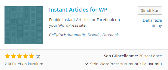 Kurulum için Wordpress panelinize giriş yaptıktan sonra Eklentiler ❱ Yeni Ekle ❱ FB Instant Articles aratarak yukarıdaki eklentiyi göreceksiniz. Bu eklentiyi "Şimdi kur" diyerek kısa süre içerisinde tamamlayabilirsiniz.