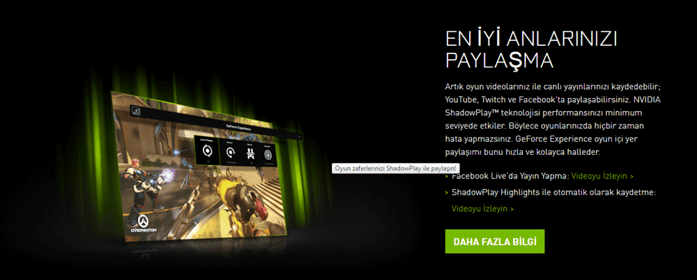 Diyelim ki Twitch kanalı açtınız ve yayın yapmak istiyorsunuz. Bir yandan oyununuzu kaydedip, diğer yandan kendi görüntünüzü kaydedip tüm bunları birleştirerek takipçilerinize sunmak gerçekten işkence olabiliyor. Ancak yine ShadowPlay üzerinden canlı yayınlarınızı açabiliyor veya videolarınızı sosyal medya platformlarında anlık paylaşabiliyorsunuz.