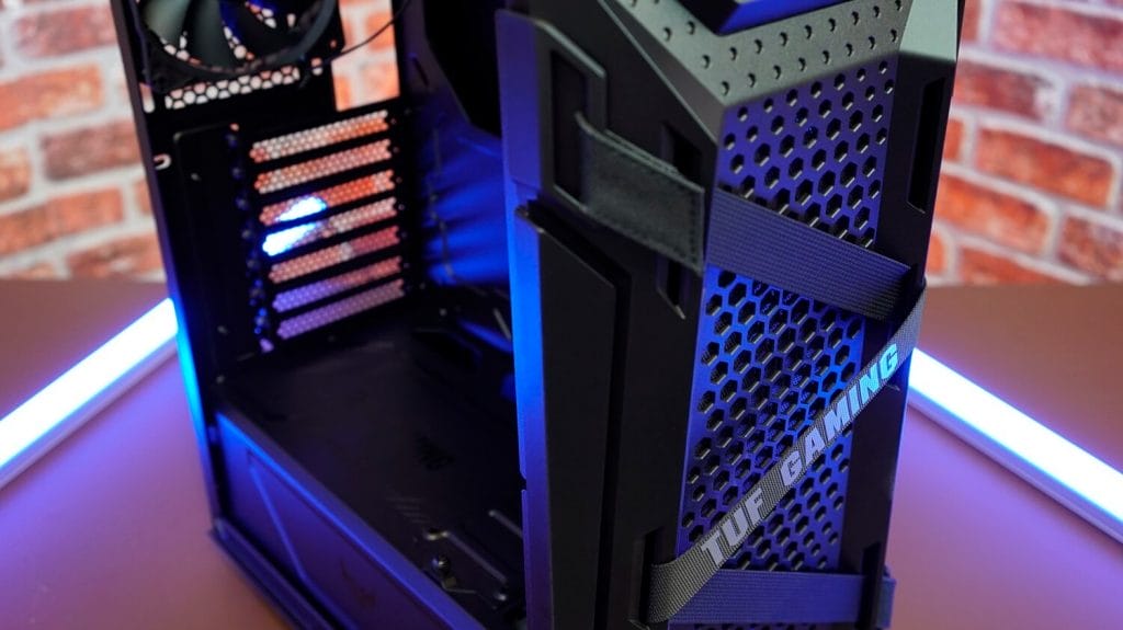 Kasanın yan tarafında temperli cam bulunuyor. Üst tarafında da tozluk yer alıyor. Ön tarafta TUF Gaming ibaresini gördüğümüz kemer bulunuyor. Bu kemerlerin görünüm açısından hoş durduğunu söyleyebiliriz.