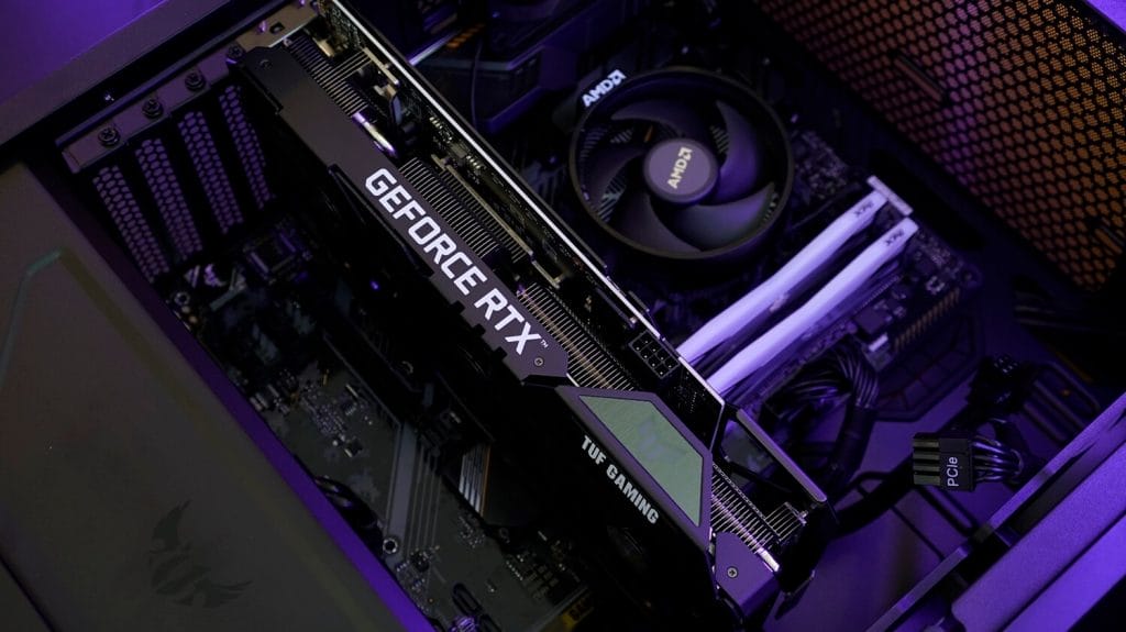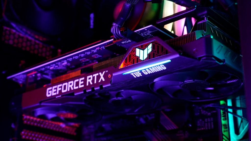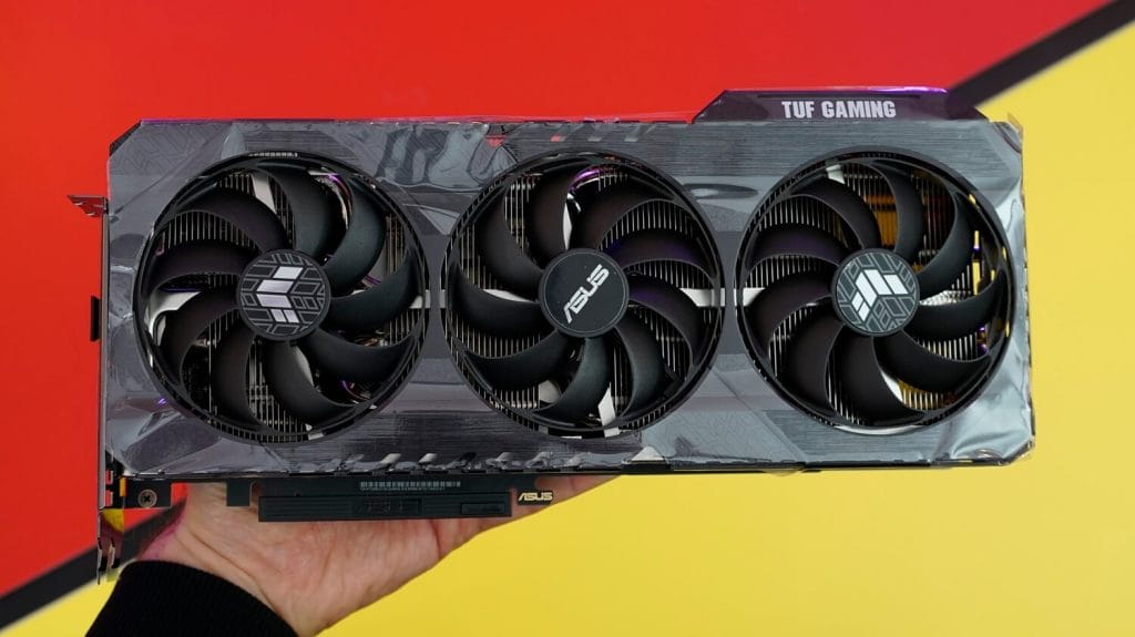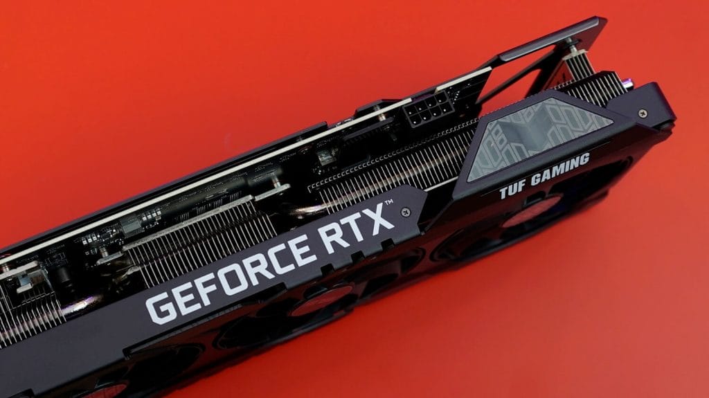 Ekran kartının yan tarafında GeForce RTX yazısının hemen yanında RGB aydınlatması bulunan bir TUF logosu da bulunuyor.