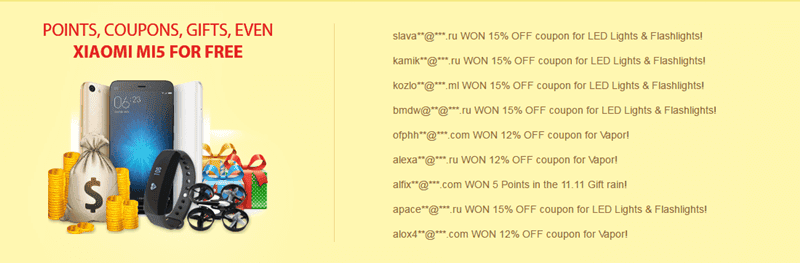 Sosyal medya üzerinden paylaşımlarınızı tamamladıktan sonra, hemen üstteki görselde kimlerin ne kadar indirim ve kupon kazandığını görebiliyorsunuz. Sizin de mail adresinizin belli bir kısmı gizlenerek buraya düşüyor. Saniyede değişen bu sistemde kişilerin hangi hediyeleri veya indirimleri kazandığı görülebiliyor.
