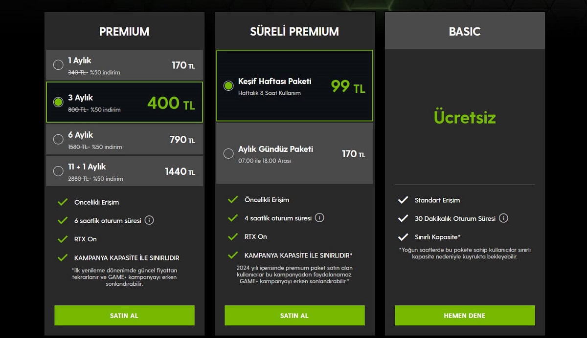 4 Farklı Premium seçeneği sunulan GeForce Now'ın paket fiyatları;