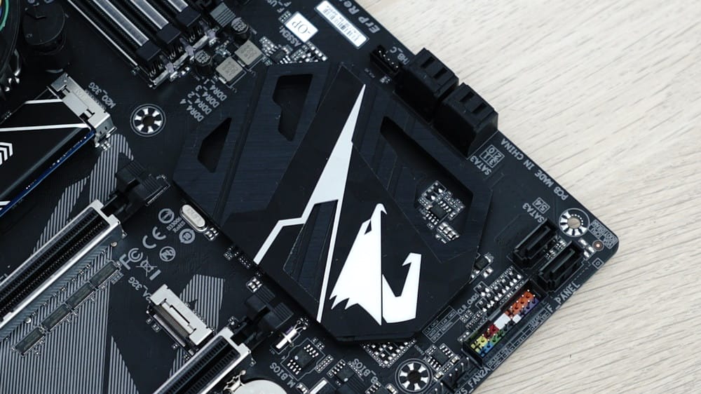 Anakart üzerinde dikkat çeken diğer tasarım detaylarında, yine kaslı yapısı ile dikkat çeken soğutma blokları ve giriş çıkış portlarını yuvalayan zırh bulunuyor. Termal yapıda olan bu zırh, anakartın soğutma performansına olumlu etkiler sağlıyor. Öte yandan anakartın orta kısmında da M.2 koruma ve soğutma zırhı görülüyorken bu blok ve zırhların üzerinde de AORUS logo ve yazısı konumlandırılmış.