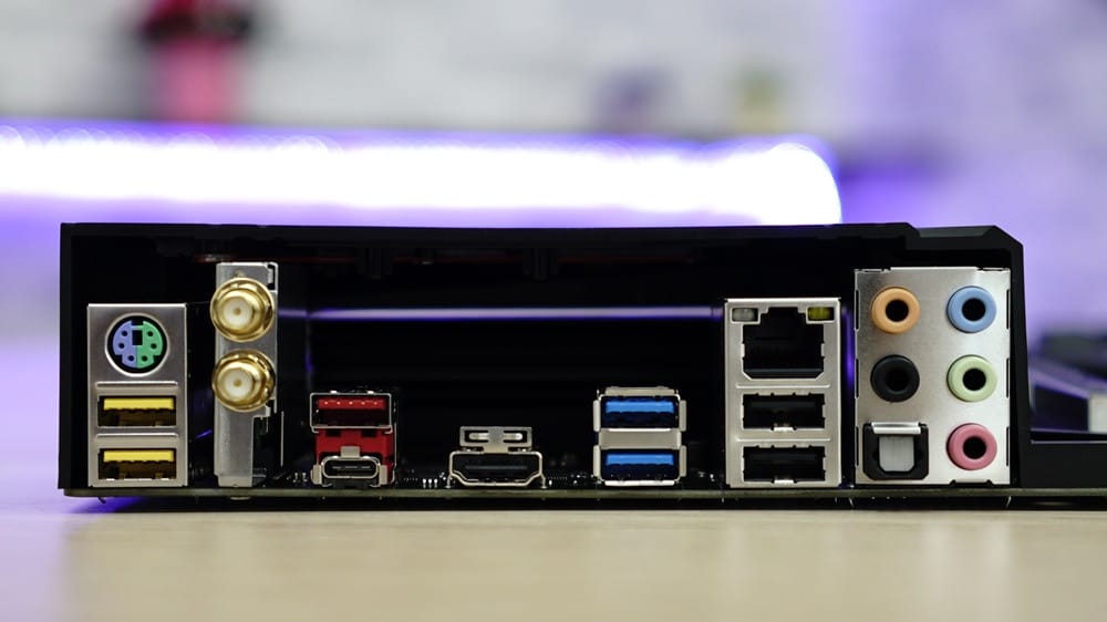 Anakartın arka giriş ve çıkışlarında ise 4 adet USB 3.1 portu dikkat çekiyor. Öte yandan USB 2.0 portlarını da ve WiFi bağlantı antenlerini de görüyoruz. Ayrıca anakartın USB Type-A ve Type-C desteği de mevcut. Görüntü çıkışında ise yalnızca HDMI yuvası görülürken, ses çıkışlarında optik ses çıkışı dahil diğer jacklar mevcut.
