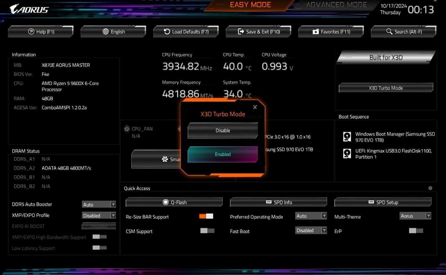 x3D Turbo Mode" sekmesi açılıyor. Buradan enabled sekmesine tıkladığımızda aktif olduğu gibi, F10 + Enter ile kaydedip çalıştırabiliyoruz.