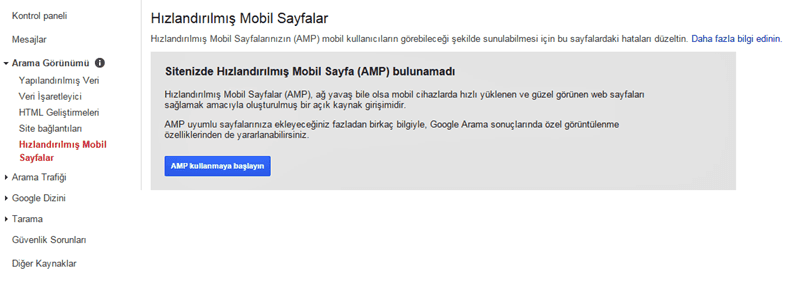 Başta Twitter, Google, Pinterest, Wordpress, Chartbeat, Parse, Analytics, Linkedin ve Adobe olmak üzere bir çok teknoloji şirketi ile anlaşan AMP artık kısa süre içerisinde HTML sayfalarına entegre ediyor olacaklar. Bu entegrasyonun testini bitiren ve kullanıcılarına duyuran ilk isim ise Google oldu. Webmaster Tools üzerinde aşağıdaki gibi bir bildirim ile karşımıza çıkan Google AMP aktif olarak kullanılmaya başlandı.