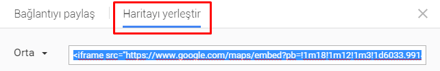 * Daha sonra tercih etmiş olduğunuz boyutu seçerek kodu kopyalamanız yeterlidir. Web sitenize bu kodu ekleyerek haritanızın görünümünü elde edebilirsiniz.