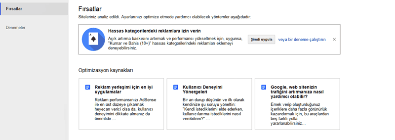 Yukarıdaki görsele yakından bakacak olursak Adsense kullanıcılarına Google'ın göndermiş olduğu "fırsatlar" sekmesindeki bu bildiri her şeyi ortaya koyuyor aslında. "Hassas kategorilerdeki reklamlara izin verin." içeriğinde Kumar ve Bahis (18+) web siteleri yer alacağı gibi, bu sitelerden kullanıcılar daha fazla para kazanabilecek.