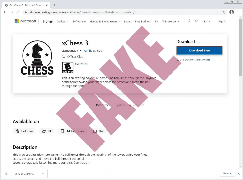Şimdi ise ayrı bir kötü amaçlı yazılım grubu buna benzer ancak biraz daha farklı bir şey deniyor. Tıpkı iPhone sorunu gibi, kötü amaçlı yazılım geliştiricileri da normal reklamları kullanarak yazılım veya oyunların reklamını yapıyorlar ve kullanıcılar reklamları tıkladıklarında resmi Microsoft Mağazası gibi görünen lakin Microsoft ile alakası olmayan sahte bir web sitelerine yönlendiriliyorlar.