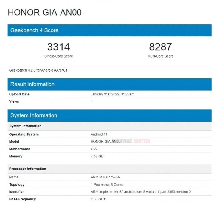 Geekbench test sonuçlarına göre Honor GIA-AN00 akıllı telefonu MediaTek'in Dimensity 900 yonga setinden güç alacak ve bellek tarafında ise minimum 8GB RAM sunacak. Ayrıca akıllı telefon kutudan çıktığı haliyle Android 12 işletim sistemiyle gelecek.