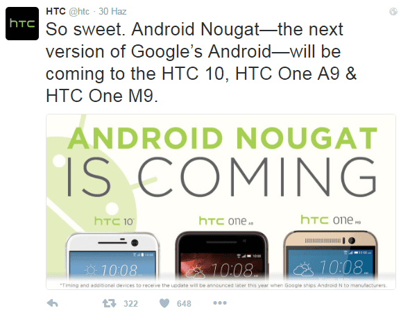 Android Nougat 7.0 güncellemesini kısa süre içerisinde alacak. Ancak HTC bu güncelleme ile ilgili henüz bir tarih paylaşmadı. Hatırlayacak olursanız HTC Marshmallow güncellemesi çıktıktan sonra 90 gün içerisinde cihazlara dağıtımını gerçekleştirmişti. Eğer Tayvanlı firma aynı politikayı uygulayacak olursa yine aynı zaman dilimi içerisinde gönderilmiş olacaktır.