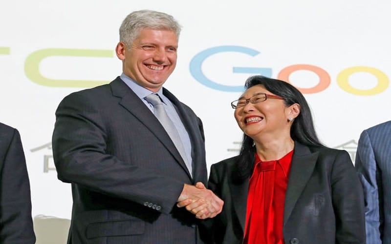 Google Donanımdan Sorumlu Yönetici Rick Osterloh ile HTC CEO'su Cher Wang anlaşmayı duyururken...