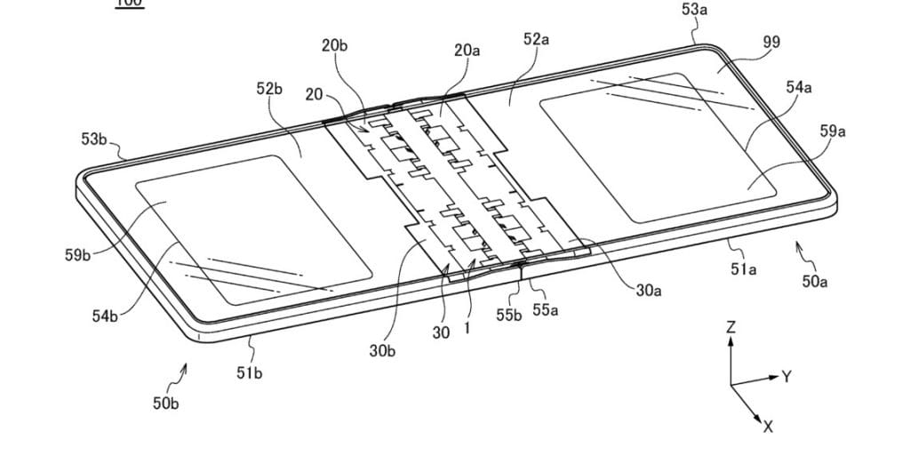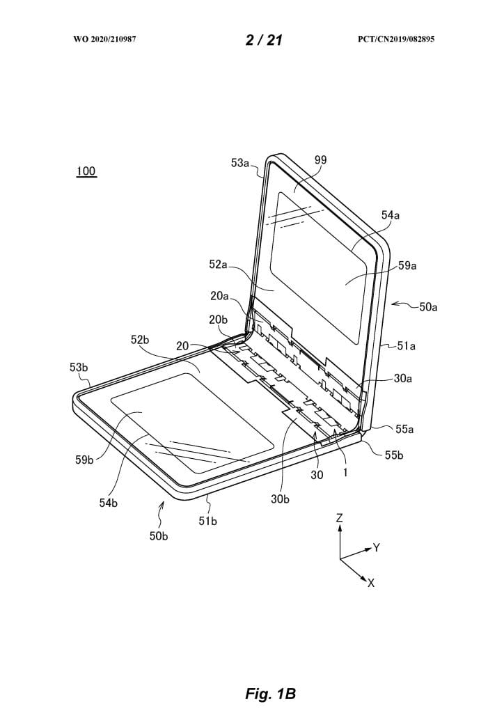 Birinci ve ikinci desteklerin dönme eksenleri, dikey yöne göre birinci ve ikinci tabanların dönme eksenlerinin dışında yer aldığından, birinci ve ikinci desteklerin ve merkezin içinde esnek bir ekranı barındırmak için ilk menteşe ünitesi kapatıldığında. bir boşluk oluşturulabilir.