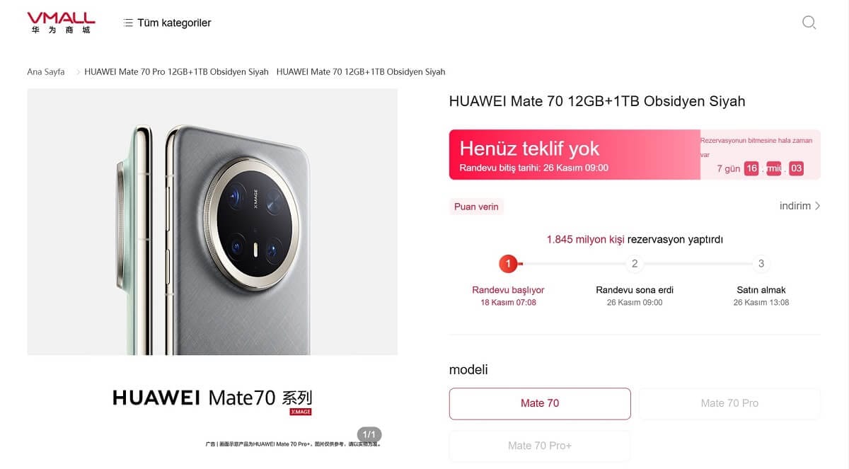 Vmall'in resmi web adresinde rezervasyona sunmasıyla seri daha da fazla netlik kazandı diyebiliriz. Model seçeneklerine baktığımız zaman Mate 70, Mate 70 Pro ve Mate 70 Pro+ olmak üzere 3 farklı versiyon bulunuyor.