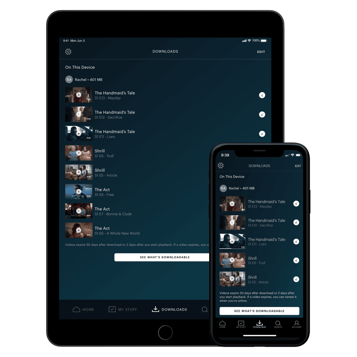 İzleyiciler, 5 farklı cihaza 25 adede kadar başlık indirebilir ve indirilen içeriğini izlemek için 30 güne kadar sürebilir. İzlenen içerik için indirme, oynatmaya başladıktan iki gün sonra sona erecek. İndirilen içeriğin süresi dolduktan sonra, içerikler Hulu'da hala mevcutsa, izleyiciler çevrimiçi olduğunda süresi dolmuş bir indirme işlemini yenileyebilir.