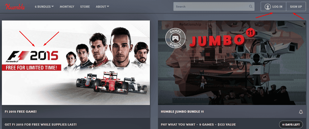 İlk olarak Humble Bundle web sitesine giriş yapın. Ardından sağ üst kısımda bulunan 'hesaba giriş' sekmesinden varsa hesabınız ile giriş, yoksa yeni bir hesap açarak ilerlemeyi deneyin. Ardından Humble Bundle anasayfasında bulunan F1 2015 görseline tıklayarak kampanya sayfasına ilerleyin.