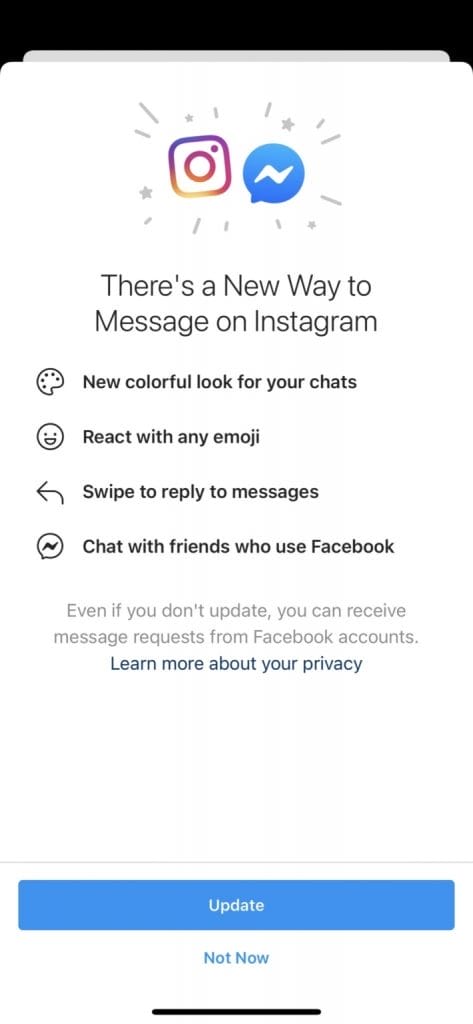 Çok sayıda Instagram kullanıcısı, bugün Instagram'a ve ardından Direkt mesaj kutularına girmek istediklerinde şirket tarafından gönderilen bir pop-up ekranı ile karşılaştırlar. Bu pop-up ekranı Messenger Entegrasyonu hakkında detaylı bilgi veriyor.