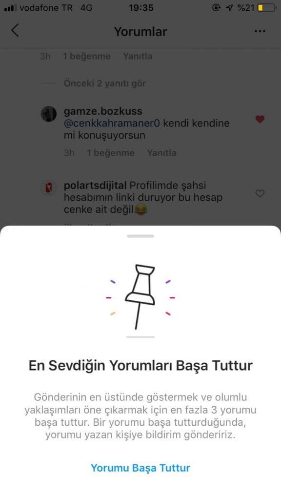Sabitlenen yorum, paylaşılan gönderinin yorumlar sekmesinde en üst kısmında yer alacak ve iğne işareti ile "Başa Tutturuldu" olarak ibare eklenecek. Böylelikle fenomen kişiler beğendikleri ve hoşlarına giden bir yorumu sabitleyerek daha fazla etkileşim alabilecekler. Yorum sabitlemek oldukça kolay ve basittir.
