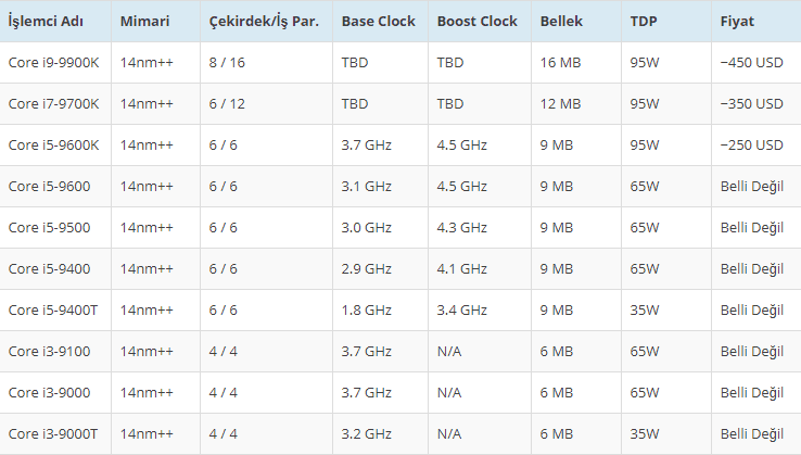 Intel bu güncelleme ile birlikte piyasaya toplamda 10 farklı 9.nesil işlemci sürmüş olacak.