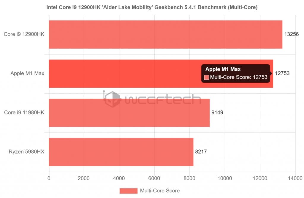 Intel Core i9 12900HK mobilite işlemci, Geekbench çok çekirdekli kıyaslama söz konusu olduğunda Apple M1 Max'i beklenmedik bir şekilde geride bırakarak Apple işlemci için 13.256'ya karşı 12.753 puan aldı. Ayrıca, yalnızca 9.149 puan alan Intel 11980HK'den yüzde 45 fark atarak daha hızlı çalışıyor.