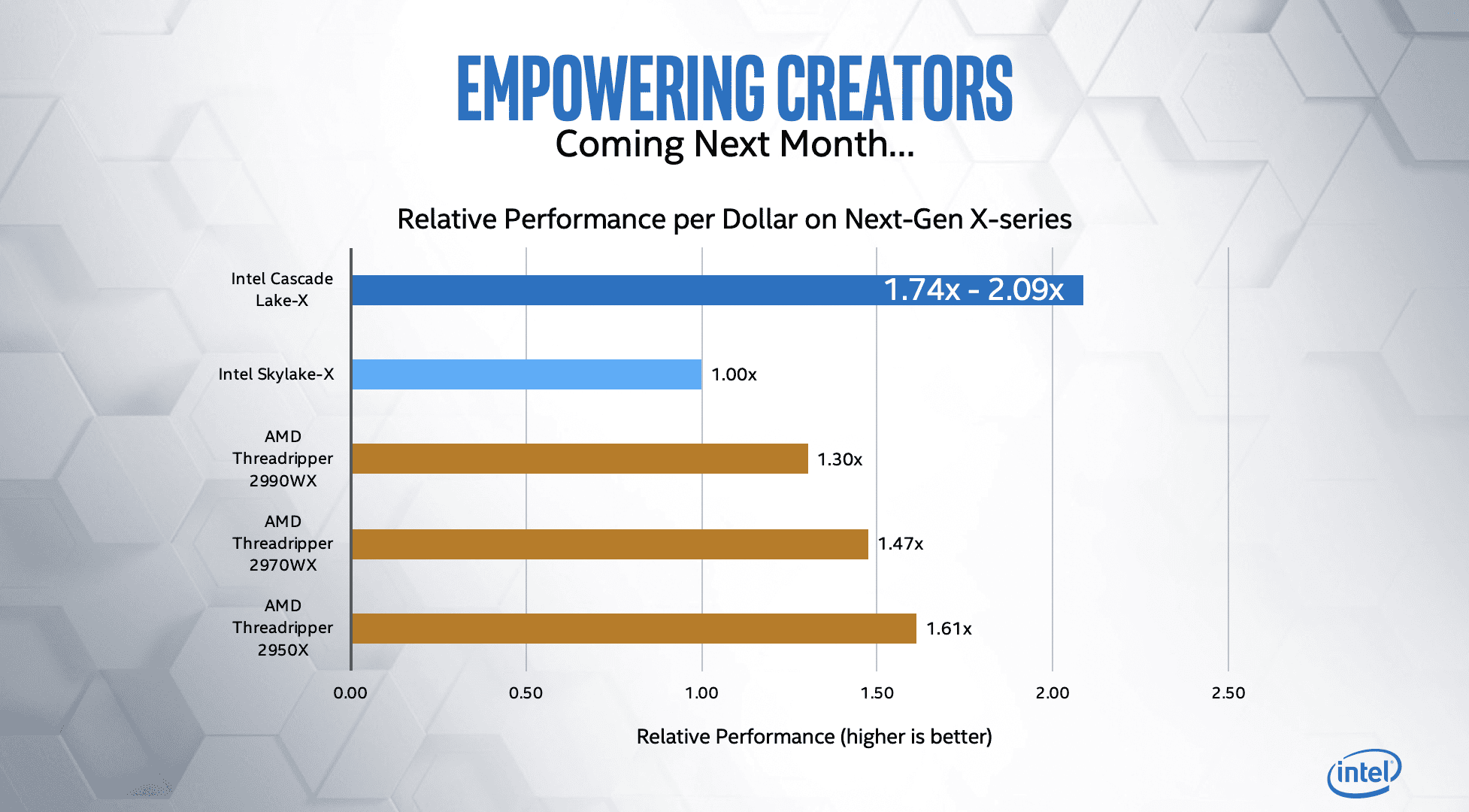 İşlemcinin teknik detayları henüz açıklanmadı. Fakat Intel yongalarının içerik üretim uygulamalarında gösterdiği performansı paylaştı. Sky Lake-X modelinin yerine gelecek işlemci, Sky Lake-X'den 1.74 - 2.09 kat daha hızlı ve performanslı çalışıyor. Model bu haliyle AMD Threadripper işlemcilerinin önüne geçmiş durumda. LGA 2066 soketli X299 yonga setli anakartlarla uyumlu olacak işlemciler önümüzdeki ay duyurulacak.