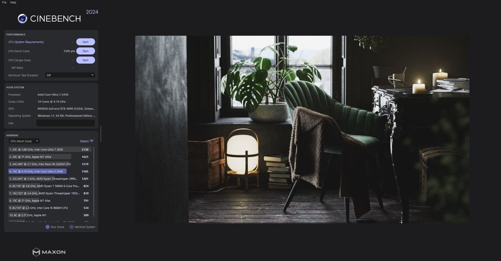 Intel Core Ultra 5 245K işlemcisi Cinebench R24 çoklu çekirdek testinden 1.505 puan alabiliyor. Bu kullandığım anakartın kendi BIOS seçeneği. Intel default settings değil. Sizin de bu şekilde kullanmanızı öneririm.