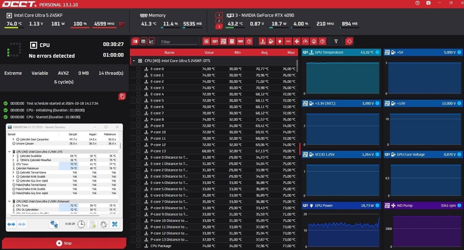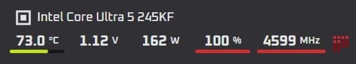 Intel Core Ultra 5 245K tam yük altında 162W güç tüketimine sahip. 1.12 voltaj aralığında ve 4.5GHz hızında çalışıyor. Bu oranlarla 73-74 derece sevindiricidir. Fakat sıvı soğutmamı düşürürsem üstüne sıcaklıkların ekleneceği aşikar.
