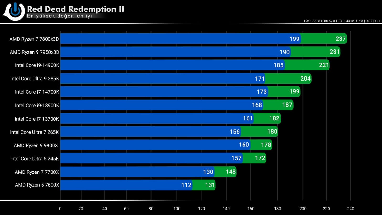 RDR2 testine geçtiğimde yine tablo benzer sonuçlar verdi. 157 ortalama ve 172 maksimum FPS ile yine işlemci 10.sırada yer alıyor. 9900X ile kapışma halindeyiz.