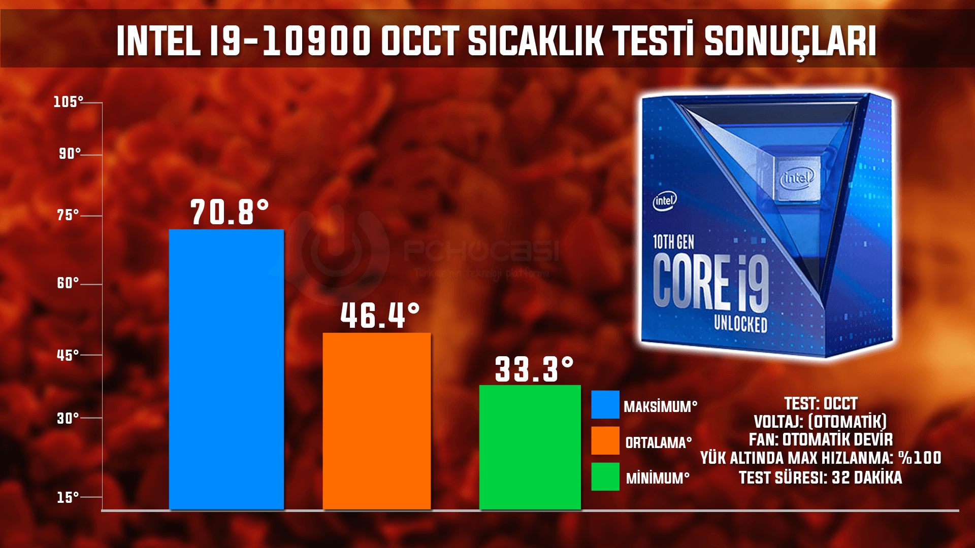 İşlemci modelimiz ise yine aynı yük testi altında 70 derece sıcaklığa ulaştı ve bu uzay montaj. Evet, Intel bu sene 14 nanometre üretim süreci altında güçlü modeller üretti ve piyasaya sundu. Fakat bu güçlü modeller ısınıyor abi. Çünkü çok fazla güç tüketimi sergiliyor. Bu gücü sabit tutmak için de, sağlam soğutucu gerekiyor. Bu önergeleri dikkate alarak Intel 10.nesil bir sistem toplamanızı tavsiye edeceğim.