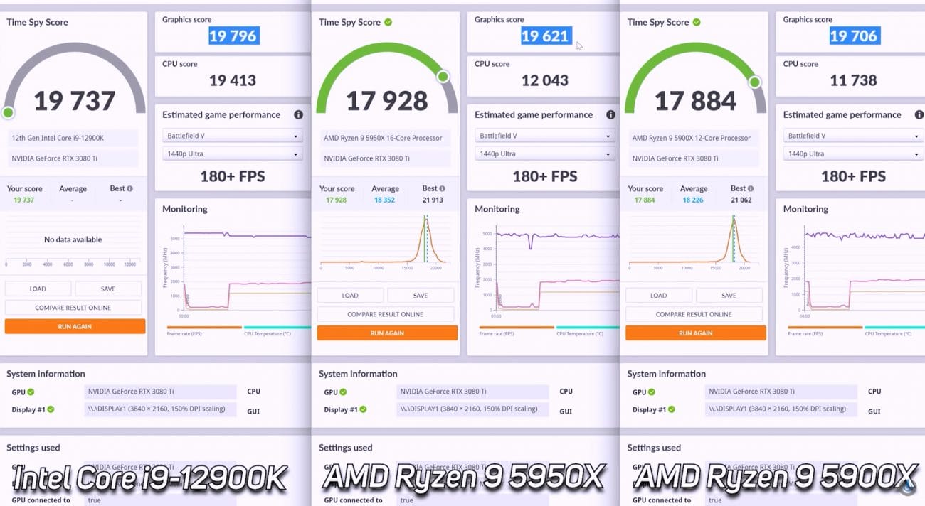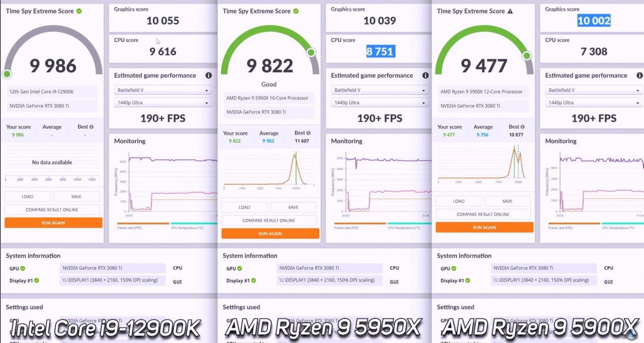 Intel i9-12900K vs AMD Ryzen 5950X vs AMD Ryzen 5900X 3DMark Testi