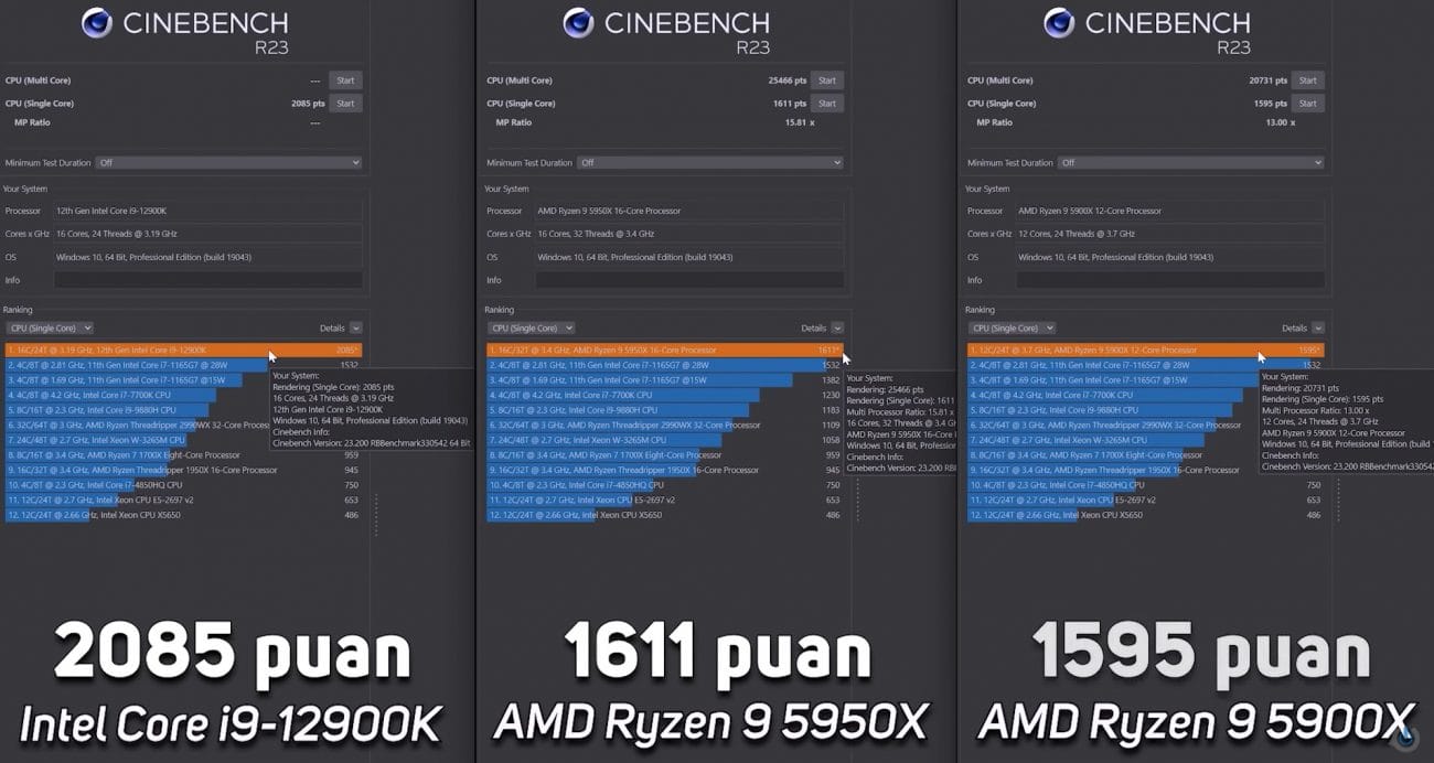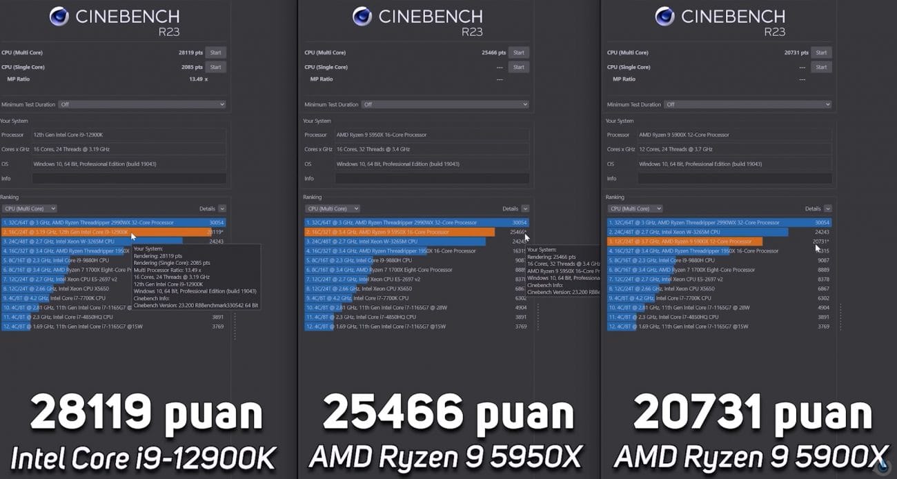 Intel i9-12900K vs AMD Ryzen 5950X vs AMD Ryzen 5900X Cinebench R23 Testi