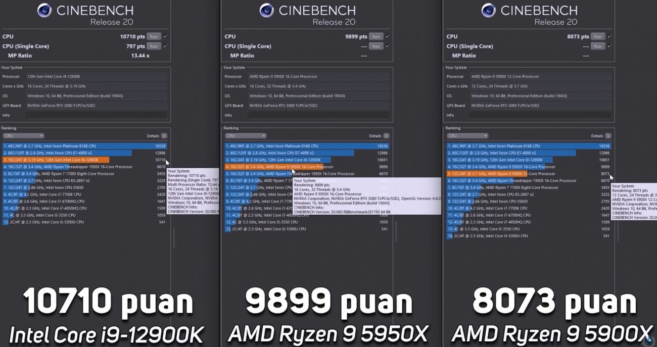 Intel i9-12900K vs AMD Ryzen 5950X vs AMD Ryzen 5900X Cinebench R20 Testi