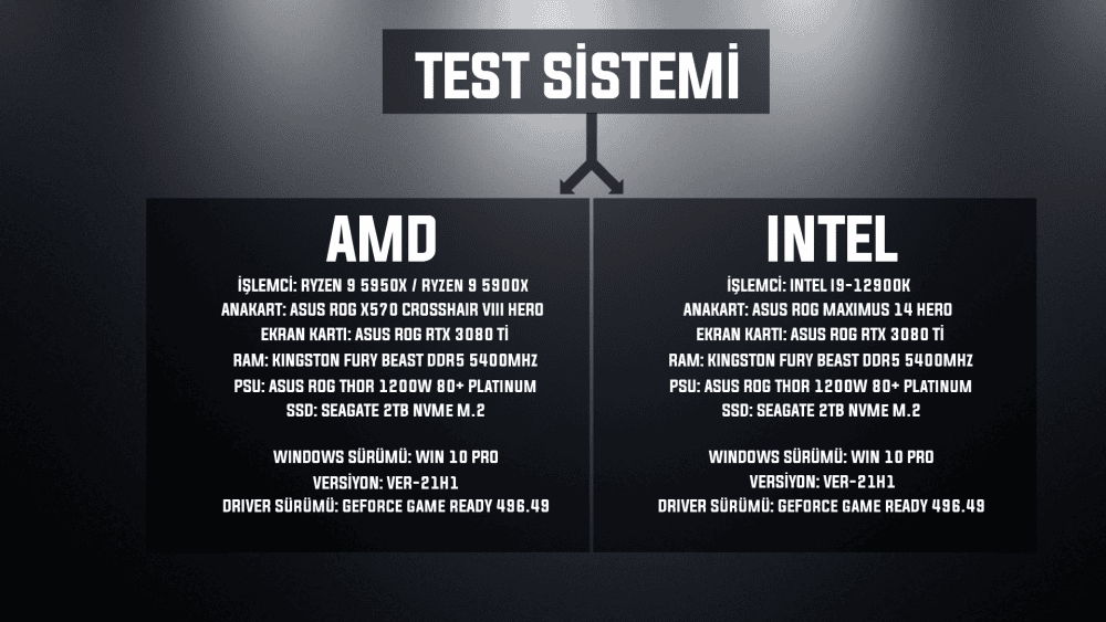 Karşılaştırmada kullanacağımız test sistemimiz hakkında bilgi verelim. AMD ve Intel için kullandığımız sistemlerde çok büyük bir fark söz konusu değil. Tabii ki soket yapısı farklı olduğu için anakartlarda bir değişim söz konusu. Intel i9-12900K için kullandığımız anakart, ASUS tarafından tanıtılan yeni nesil anakart ASUS ROG Maximum Hero. Ona da test sonunda geleceğiz. Sistemleri ayrı ayrı verelim. AMD için Kullandığımız Sistem- İşlemci: Ryzen 9 5950X / Ryzen 9 5900X