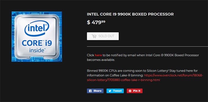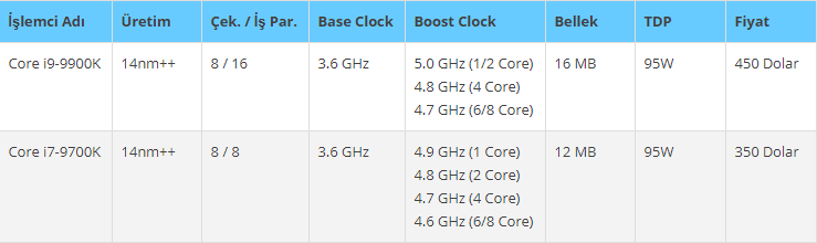 Şuanda ABD'de Intel Core i9-9900K işlemcisinin perakende fiyatı 480$ olarak listeleniyor. i7-9700K işlemcisi ise 370$ fiyat etiketine sahip. Ancak ufak bir detaydan daha bahsedelim; Piyasaya sürülecek olan üç işlemciden sadece 2 tanesinin detayları mevcut. Bunlar arasında şimdilik 8 çekirdekli ve 16 izleğe sahip Core i9-9900K ve 8 çekirdek 8 izleğe sahip Core i7-9700K bulunuyor.