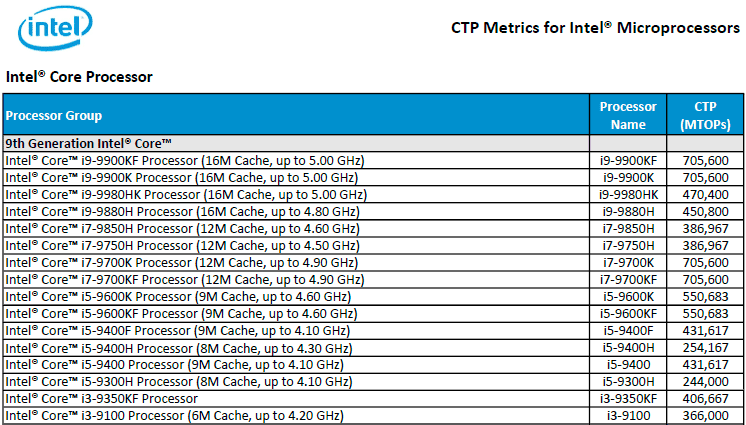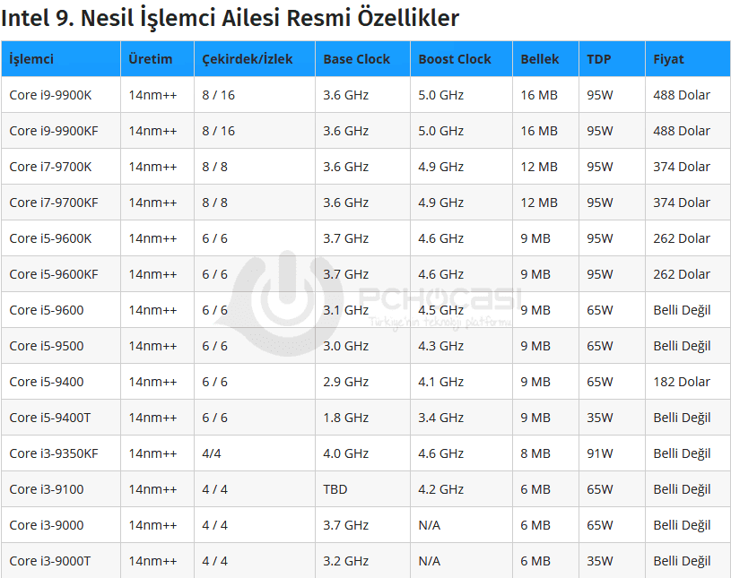 Aşağıdaki resmi listede ise entegre GPU'yu devre dışı bırakacak olan "KF" ismi ile gelecek işlemciler var. Bunlar Core i9-9900KF, Core i7-9700KF, Core i5-9600KF, Core i5-9400F ve Core i3-9350KF olarak listeleniyor. Bu işlemciler arasındaki en temel fark, Intel'in içerisine yerleştirdiği dahili grafik birimi iGPU'nun olmamasıdır. Bu sayede çarpan kilitleri açılmış, daha yüksek performans ve hız arayan kullanıcılara yönelik olacak.