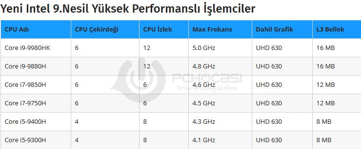 Aşağılara doğru indikçe karşımıza Core i7-9850H ve Core i7-9750H işlemcileri çıkıyor. Bu modeller de 6 çekirdek ve 6 izlek ile birlikte gelirken, sırası ile 4.60 GHz ve 4.50 GHz saat hızlarına sahiptir. Her iki işlemci 12 MB L3 ön bellek ile donatılmıştır.