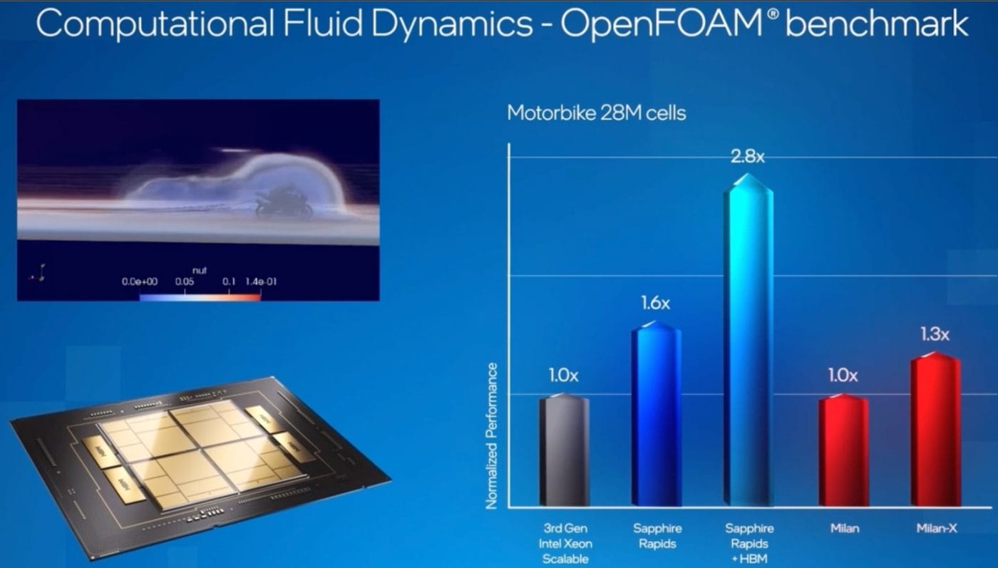 Öyle ki OpenFOAM testlerine göre firma, HBM2E’nin kullanıldığı Intel Sapphire Rapids işlemcilerinin, AMD Milan-X serisini ciddi bir farkla geride bıraktığını gösterdi. Çok detay verilmedi ve hangi işlemci modellerinin testlere alındığı açıklanmadı ama HBM2E bellekli modellerin, standart Sapphire Rapids modellerine göre %120 daha iyi performans verdiği belirtildi. Bir önceki nesil olan Ice Lake-SP modeline göre ise %180’lik bir performans artışından söz ediliyor. En yakın rakip olarak gösterilen AMD EPYC Milan-X işlemcilerinden ise %115’lik daha iyi performans elde edileceğini görüyoruz. En azından Intel’in paylaştığı test sonuçlarına göre bu durum geçerli.