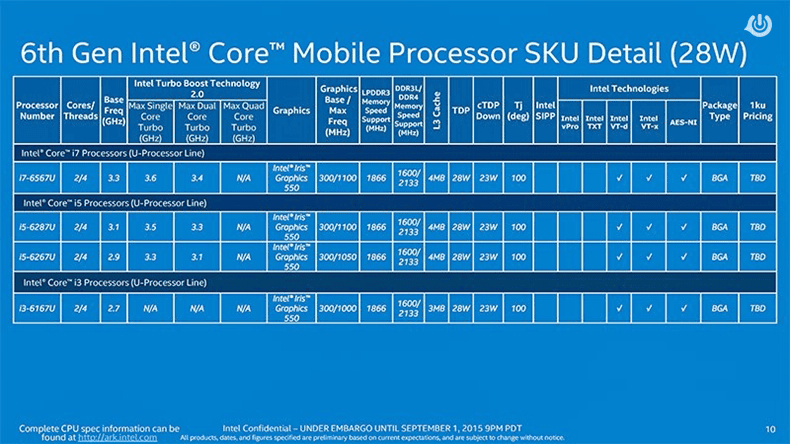 Skylake U serisi ise 15 Watt TDP değeri ile birlikte 6.nesil Core i3, i5 ve i7 isimleri ile karşımıza çıkmaya hazırlanıyor. Son olarak Skylake H işlemcileri ise yine i3, i5 ve i7 modelleri ile birlikte gelecek. Yüksek performansları nedeni ile 35 veya 45 Watt TDP değerlerine sahip olacaklar. Bu işlemcilerin arasında overclock imkanı sunan Core i7-6820HK yer alıyor.