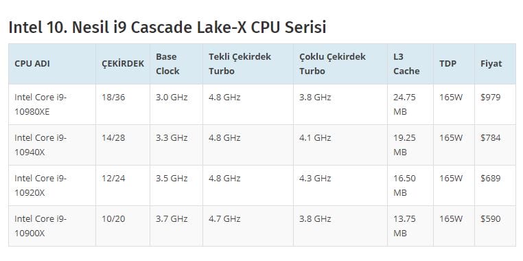 Yeni ürün grubu hala Skylake-X mikro mimarisine ve 14nm sürücüye dayanıyor. Ancak şirket 10. nesil işlemcilerin piyasada önemli ölçüde daha rekabetçi olması için şu adımları attı;