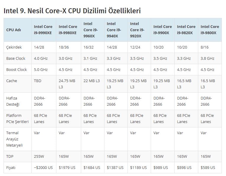 Intel geçtiğimiz ayın başlarında 10. Nesil Core X işlemcilerini tanıtacağının sözünü vermişti ancak bu sözünü tutamamıştı. Yapacağı lansmanda yeni fiyat/performans işlemcilerini tanıtacağını vaat ediyor. Şirket 4 adet birbirinden farklı çekirdek sayısına (18, 14, 12, 10) sahip 10. nesil işlemcilerini tanıtacak. Bu işlemcilerin hepsi hız aşırtması destekli ve şirketin yeni geliştirdiği Turbo 3.0 teknolojisine sahip.