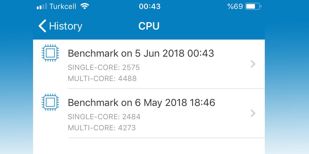 Benchmark ve son yorumiOS 12 Developer Beta incelemesi yaparken yüklemeden önce geekbench testi yapmayı unuttum ancak elimde daha önce iOS 11.3.1 sürümü ile yaptığım test mevcut. iOS 11.4 ile aralarında aman aman bir fark görmediğim için yine mevcut bench skorunu baz alacağım. Eğer tatmin olmazsanız geekbenchin resmi sitesinde iOS 11.4 puanına bakabilirsiniz. Daha önce iOS 11.3.1 yüklü cihazda geekbench ile yaptığım performans testinde cihazım tek çekirdekte 2484 puan, çok çekirdekte ise 4273 puan elde etti. Aynı cihazda iOS 12 Developer Beta ile gerçekleşen testte ise tek çekirdek puanı 2575 olurken, çok çekirdek puanı 4488 oldu. Yani az da olsa Developer Beta için oldukça iyi bir performans artışı söz konusu ki bunu kullanırken hissediyorsunuz.