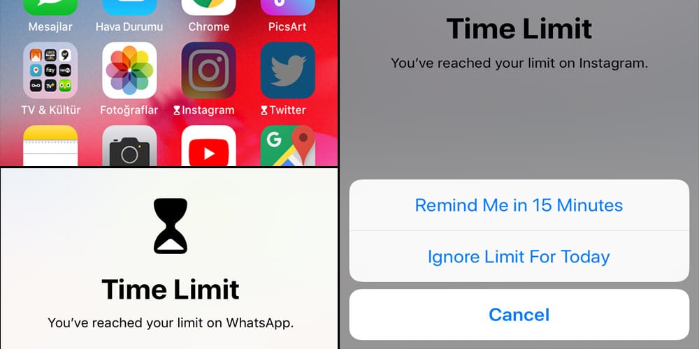 Öte yandan Apple'ın duyurduğu bir başka güzel özellik ise ekran sınırlama sistemi. Ayarlar bölümüne eklenmiş bu uygulama ile dilediğiniz bir uygulamayı ne kadar kullandığınızı görebiliyor ve bu uygulamaya günlük kullanma süresi atayabiliyorsunuz. Belirlediğiniz süre dolduktan sonra uygulama açılırken size bir uyarı veriliyor ve limitinizi doldurduğunuz bilgisi paylaşılıyor. Tabii ki limiti iptal etme ya da ek süre alma imkanınız var.