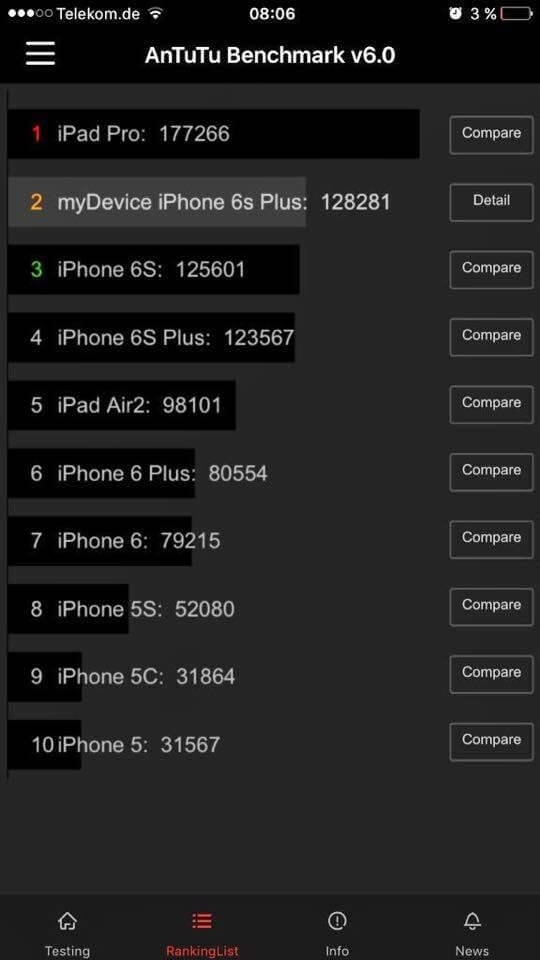 Yapılan test sonuçlarına göre AnTuTu test sonucunun ilk basamağında 177266 puan ile iPad Pro zirvede bulunuyor. Ardından iPhone 6S 125601 puan alarak ikinci basamağa yükselmiş durumda. Uzun zamandır yapılan diğer testlerde yüksek puanlar alarak gündemde olan iPhone 6S'in AnTuTu güncel versiyonu da merak ediliyordu. Ancak yine farklı bir sonuç çıkmadığı için performans açısından en iyi ikinci telefon oldu.