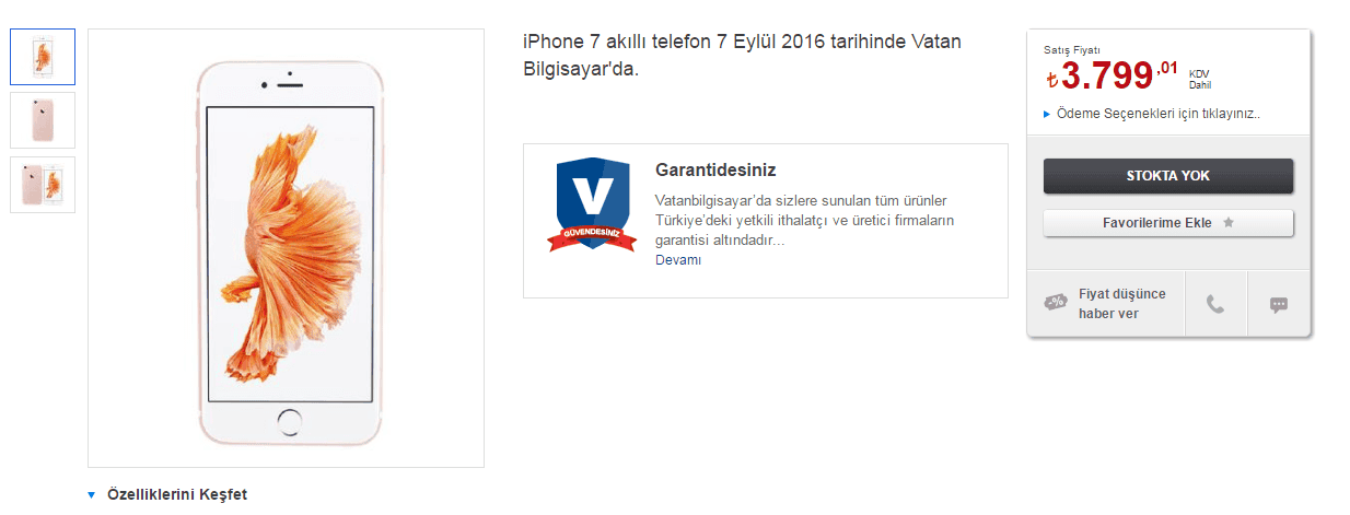 E-ticaret siteleri iPhone 7 satışları için ön hazırlıklarını tamamlarken, Vatan Bilgisayar da iPhone 7 için bir ön tanımlı sayfa oluşturarak fiyatını açıklamış. Bu fiyat diğer firmalar arasında üç aşağı beş yukarı düşük olacaktır. Ancak yine de 4 bin TL'ye yakın rakamlardan bahsediyoruz. Ülkemizde bu kadar kolay para kazanıp veya kazanamayıp, iPhone 7'ye bu parayı vermek biraz "akıl dışı hareket" olarak algılanabiliyor.