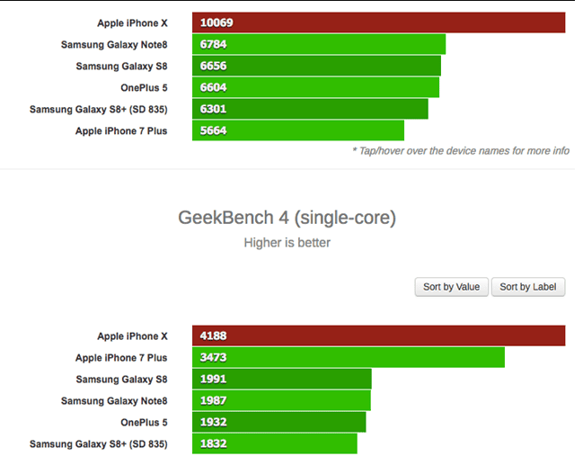 Üstte görülen grafikte iPhone X çoklu çekirdek performansında en yakın rakibi olan Samsung Galaxy Note 8'e 3285 puan gibi ciddi bir fark atmış durumda. Çoklu çekirdek performansında ise üçüncü sırada Samsung'un amiral gemilerinden Galaxy S8 modelini görüyoruz.