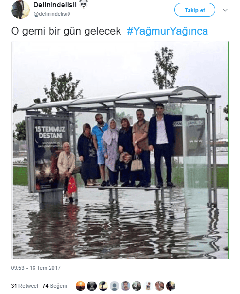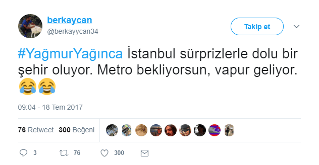 Dün gece saatlerinde başlayıp sabahta şiddetini arttırarak devam eden yağmur İstanbullulara zor anlar yaşattı. Metroları da dolduran su baskını ulaşımı neredeyse imkansız hale getirdi. İstanbul valiliğinden gelen açıklamada, "Bugün ilimiz yoğun yağış aldığından ulaşımda sıkıntı yaşanmaması için zorunlu olmadıkça özel araçlarla trafiğe çıkılmaması rica olunur" dendi. En çok yağışı alan Silivri de mahsur kalanlar botlar ile kurtarıldı. Hal böyle olunca twitter fenomenleri de çıkan malzemeyi geri tepmedi ve ortaya birçok caps çıktı. Bugün atılmış öne çıkan capsler şu şekilde;