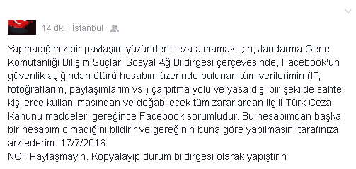 'Durum çok ciddi. Yapmadığımız bir paylaşım yüzünden ceza almamak için, Jandarma Genel Komutanlığı Bilişim Suçları Sosyal Ağ Bildirgesi çerçevesinde, Facebook'un güvenlik açığından ötürü hesabım üzerinde bulunan tüm verilerimin (IP, fotoğraflarım, paylaşımlarım vs.) çarpıtma yolu ve yasa dışı bir şekilde sahte kişilerce kullanılmasından ve doğabilecek tüm zararlardan ilgili Türk Ceza Kanunu maddeleri gereğince Facebook sorumludur. Bu hesabımdan başka bir hesabım olmadığını bildirir ve gereğinin buna göre yapılmasını tarafınıza arz ederim. 18/7/2016