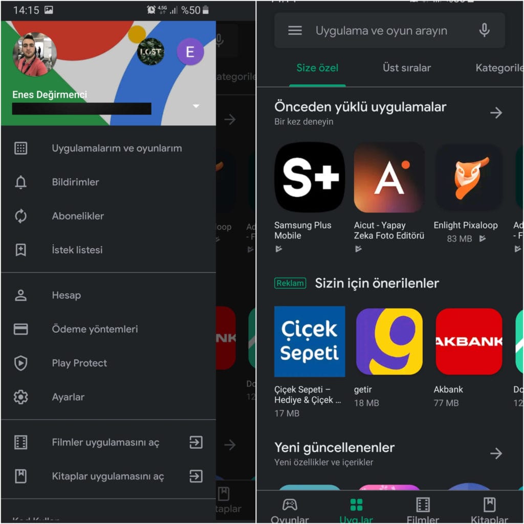 Burada önemli bir detay daha var. Cihazınızın 'Gece Modu' ya da 'Karanlık Mod'unun aktif olması gerekiyor. Doğru orantılı bir şekilde cihazınızdan olan karanlık mod Play Store'da da aktif olmuş oluyor.