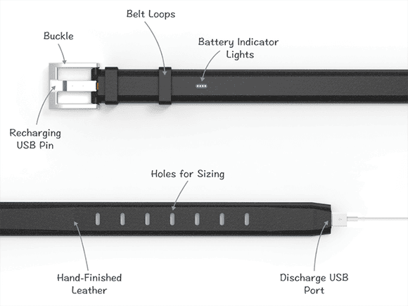 Power Blank görevi gören bu kemerin şarjı bittiğinde ise kabloya ihtiyaç duymadan toka kısmında bulunan USB girişine bağlamanız yeterli oluyor.