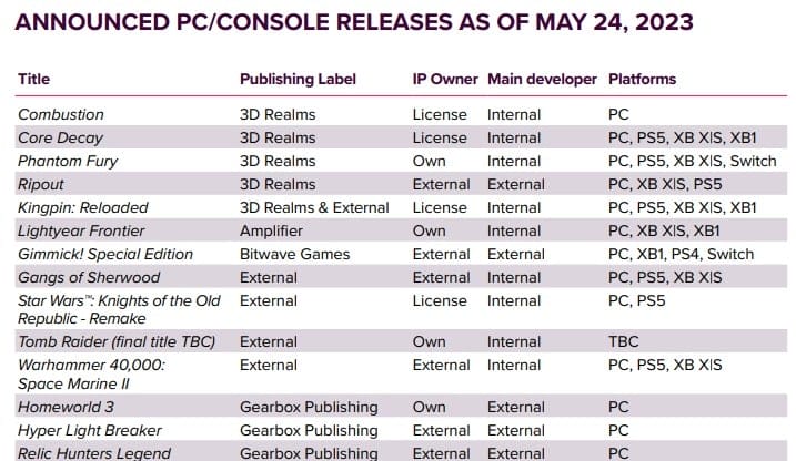 Embracer Group geçen günlerde bir rapor yayınladı. Bu raporda 23 Mayıs 2023'ten itibaren hem çıkan hem de geliştirilmekte olan oyunlar için bir bölüm yer alıyordu. Raporda şirketin bir çok diğer oyunu yer alsa da gözümüze çarpan